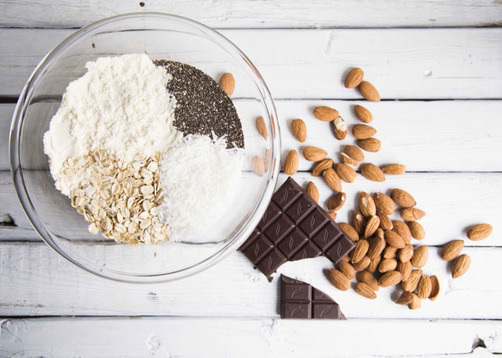 - Incorporer la poudre de protéines jusqu’à consistance lisse, puis ajouter l’avoine, les graines de chia, le lait d’amande et les flocons de noix de coco.